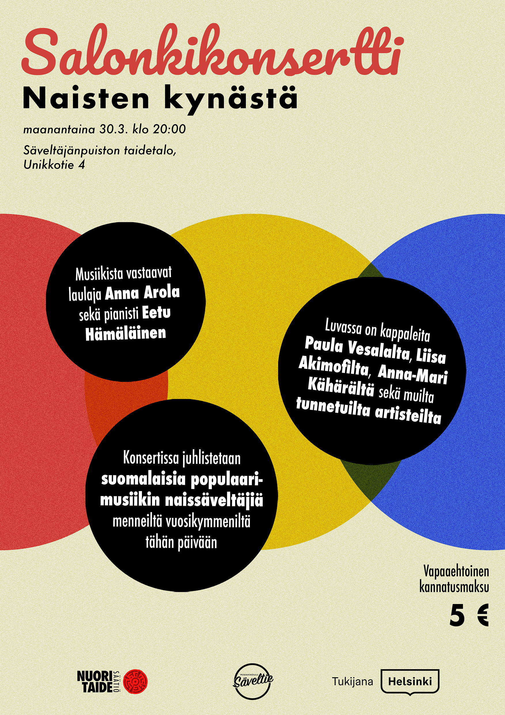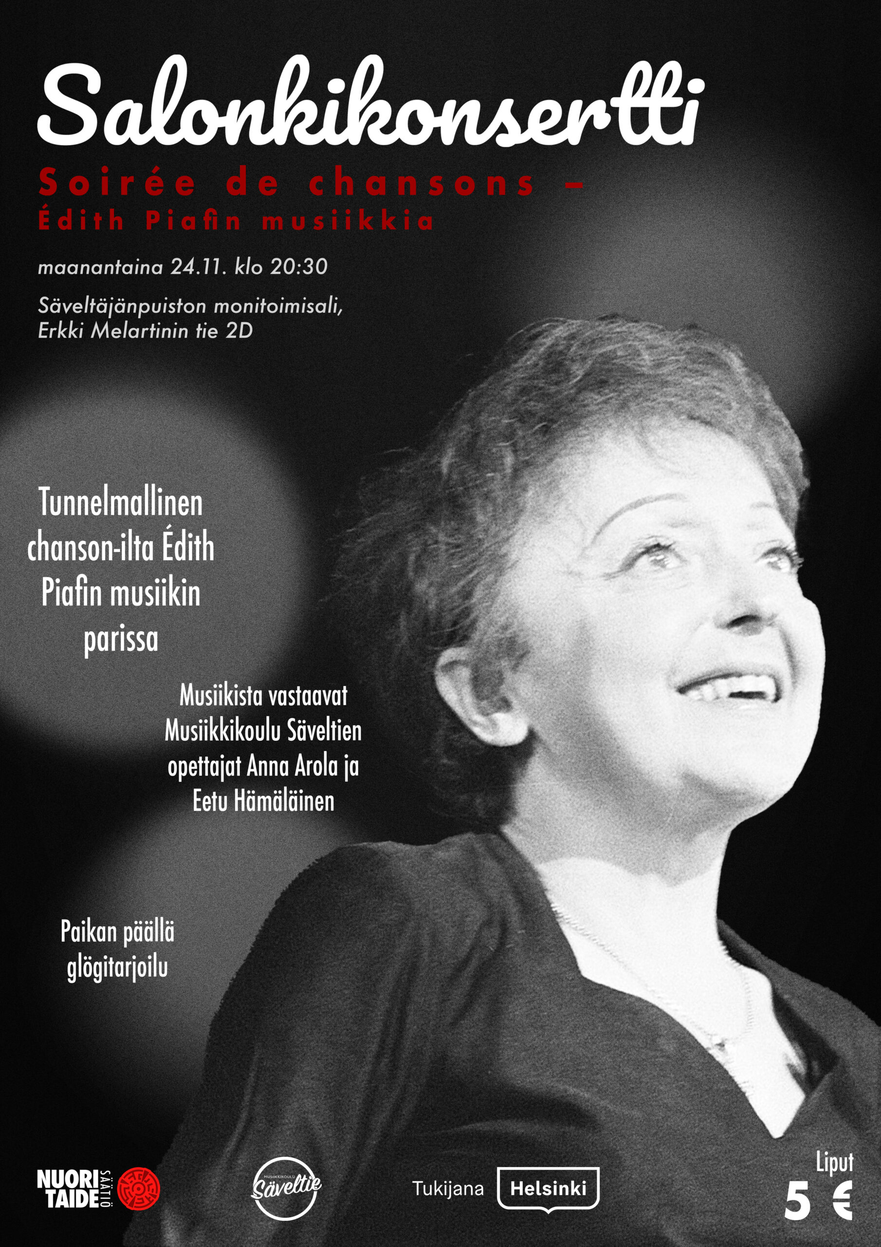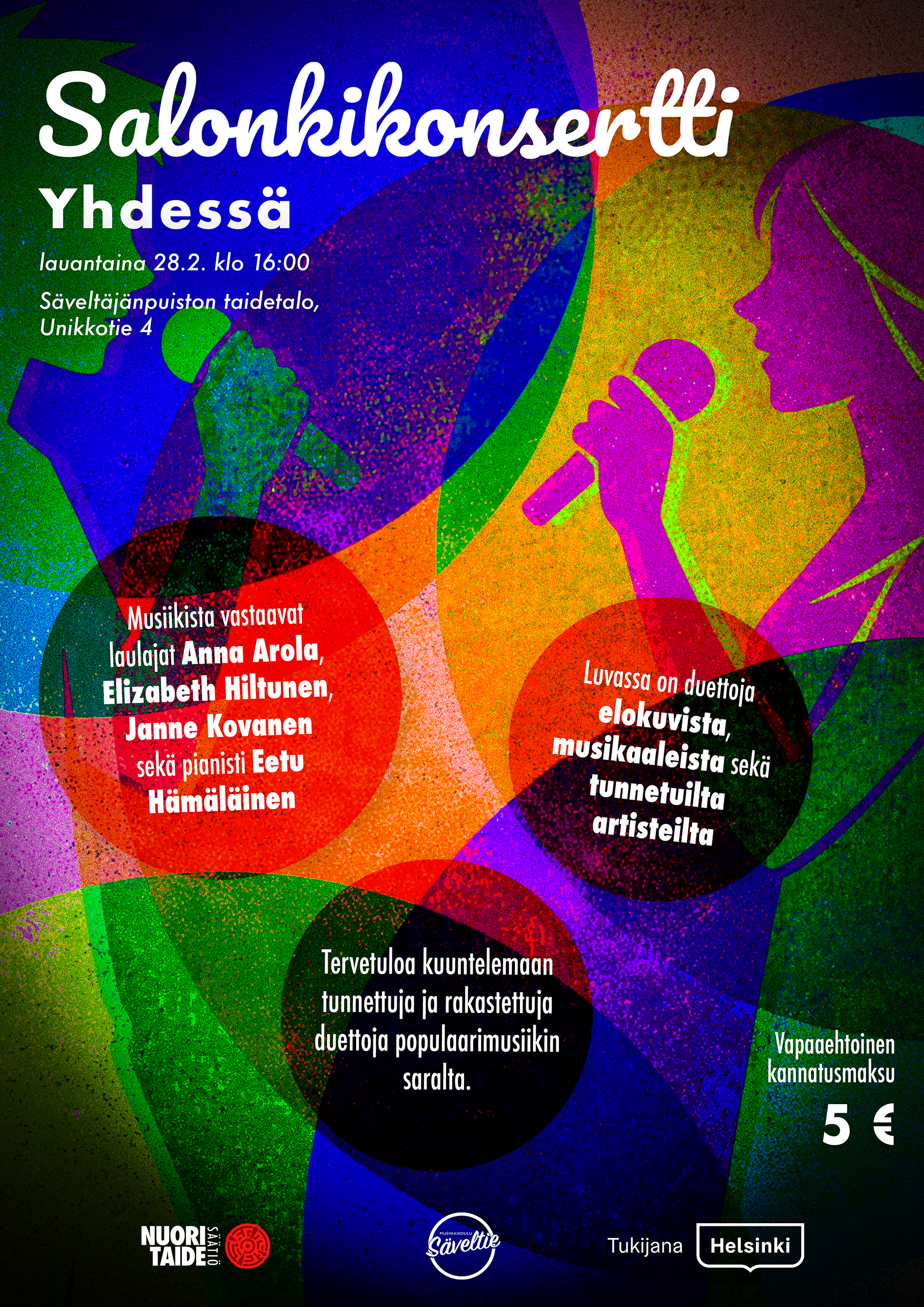 Salonkikonsertit tarjoavat intiimin ja tunnelmallisen konserttielämyksen, jossa musiikki tulee lähelle kuulijaa. Konserttipaikka, Säveltäjänpuiston taidetalon salonki kutsuu mukaan nauttimaan lämmintunnelmaisista konserteista sekä niiden yhteydessä järjestettävästä muusta toiminnasta, kuten taidenäyttelyistä ja runonlausunnasta. Kuukausittaisilla konserteilla on aina jokin erityinen teema, joka kantaa läpi konsertti-illan. Konsertteja järjestävät yhteistyössä Nuori Taide -säätiö ja Musiikkikoulu Säveltie.
